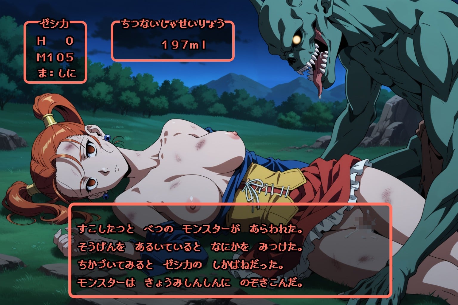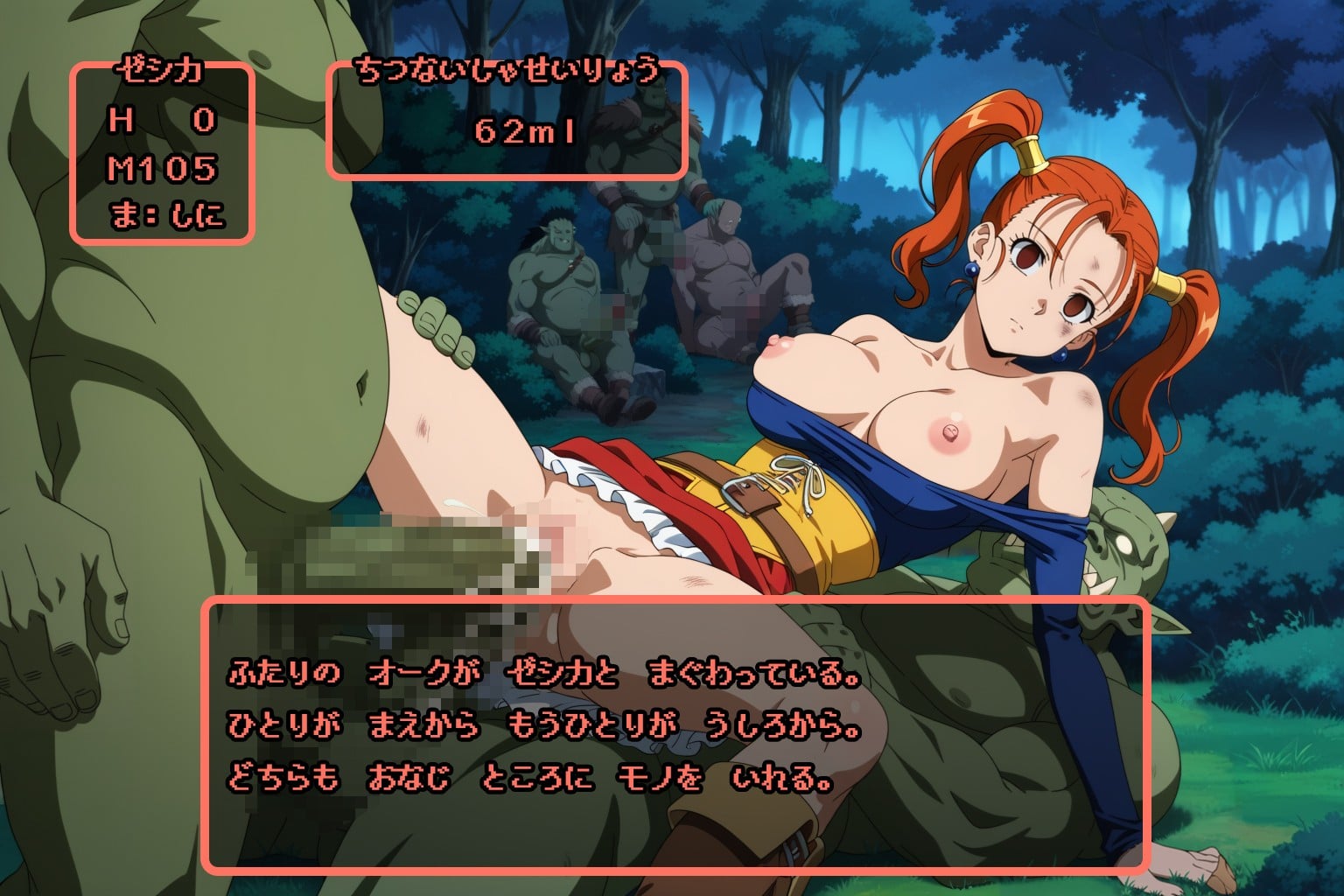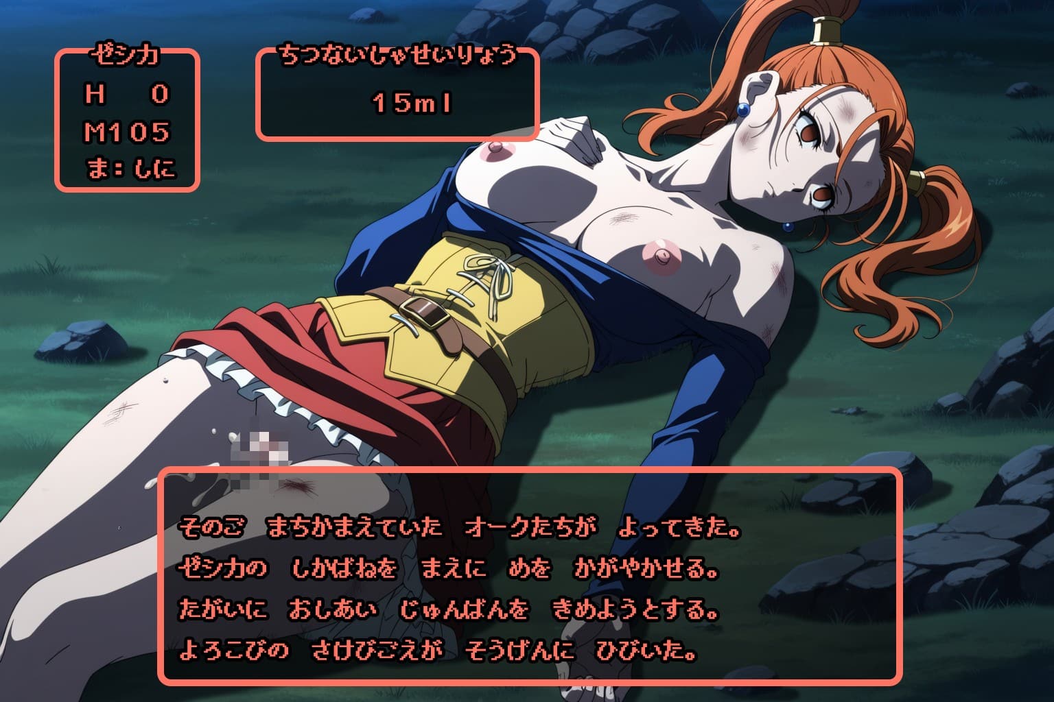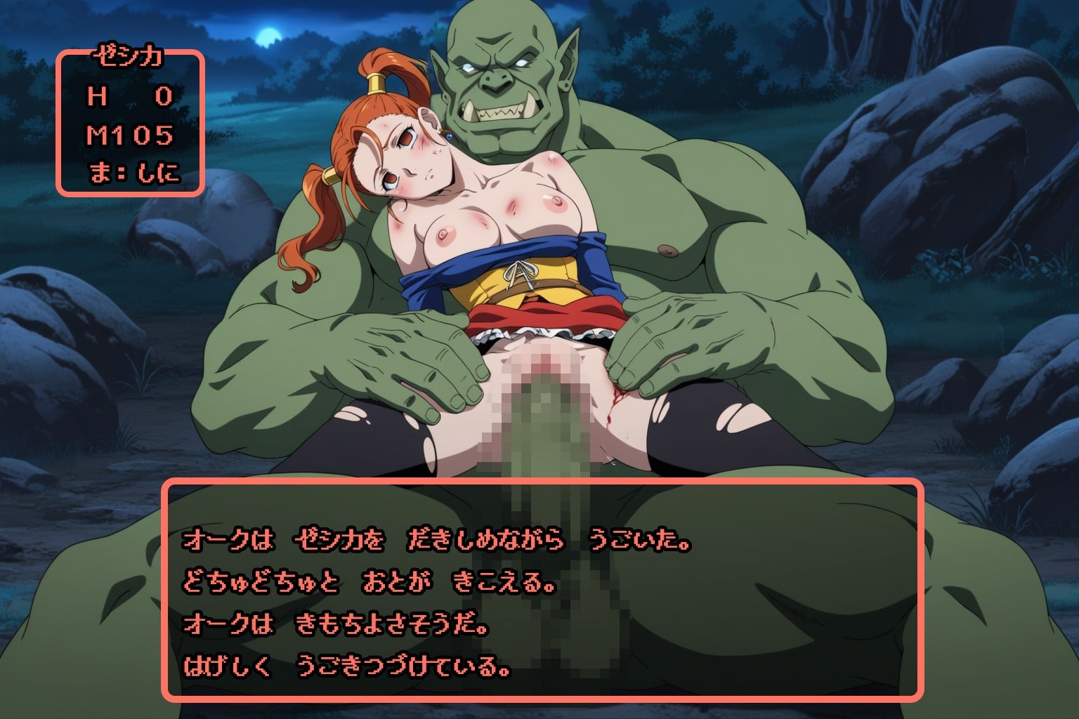 ゼシカ・アルバートが夜の草原を一人で歩いているところにオークの群れが現れた!どんどん増えていくオークに抗えずボコられて死んでしまい、そのままオーク達の性処理オナホとして利用されてしまう…
