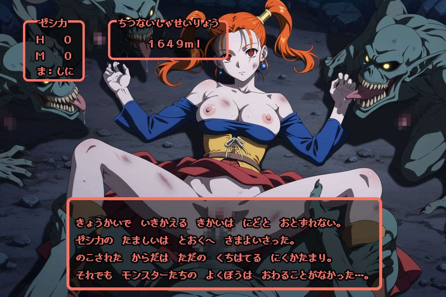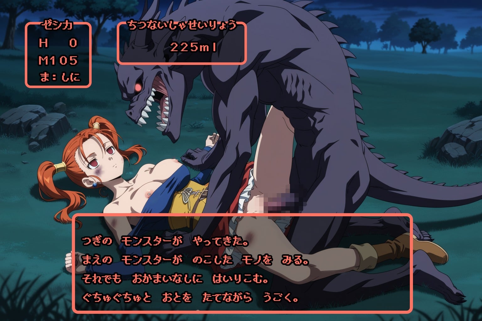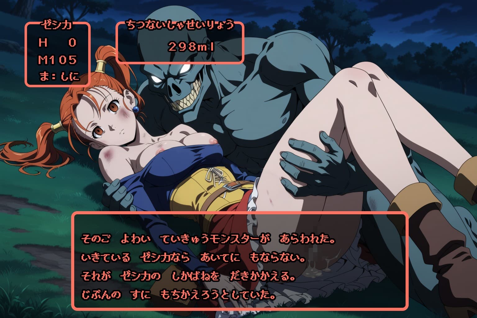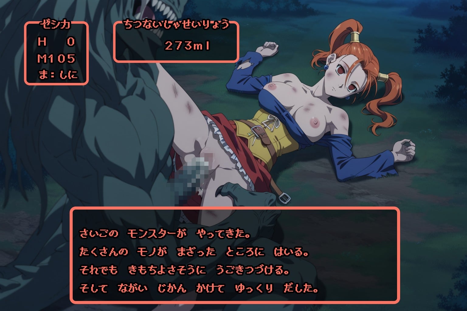 ゼシカ・アルバートが夜の草原を一人で歩いているところにオークの群れが現れた!どんどん増えていくオークに抗えずボコられて死んでしまい、そのままオーク達の性処理オナホとして利用されてしまう…