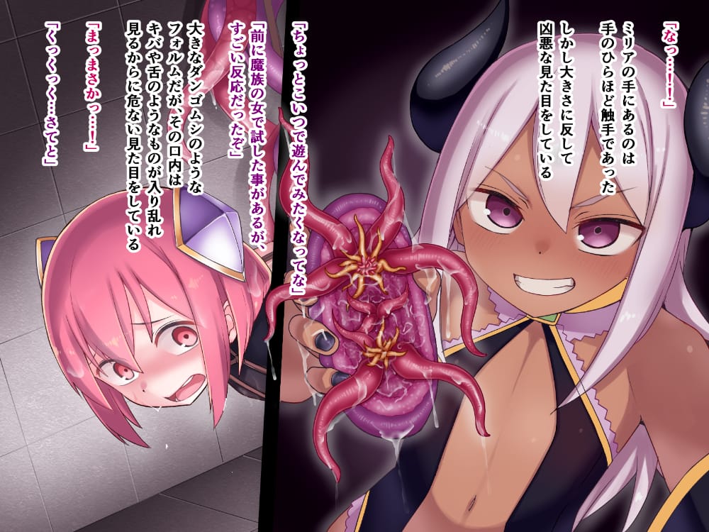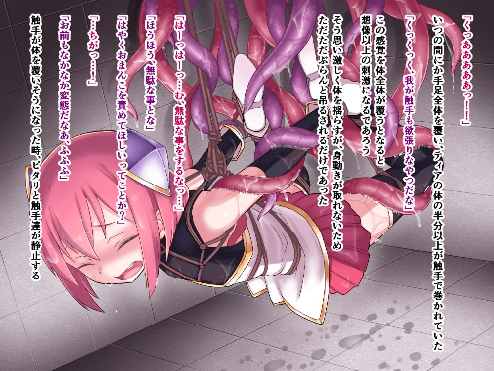 魔物を率いる魔王に戦いを挑む聖騎士ティアが、圧倒的な力の前に完全敗北してしまう…!触手で拘束されてしまい、全身ヌルヌル責めでイカされまくって…
